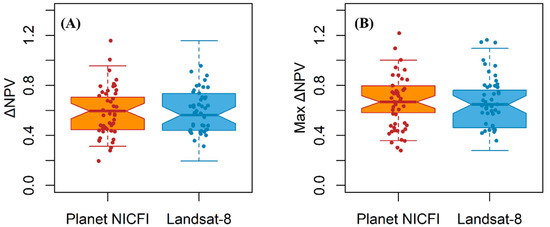 The difference (ΔNPVfirst) between the mean NPV in the blowdown first visible image and the mean pre-blowdown raw NPV for both satellites was not significantly different considering a 5% significance level (Figure 5). Most of the ΔNPVfirst values were between 0.3 and 0.8, meaning that the blowdown events generally caused a moderate to substantial decrease in NPV relative to the pre-disturbance conditions, with some sites experiencing more severe damage. However, the fact that the majority of the values fall within this range suggests a relatively consistent impact across the study sites. The maximum ΔNPV for PlanetScope NICFI is larger than its ΔNPVfirst, whereas for Landsat-8, the two attributes are not significantly different. Furthermore, the maximum ΔNPV of PlanetScope NICFI was relatively higher than the distribution of OLI Landsat-8. This indicates that, while the recovery of reflectance values after a disturbance varies between the two satellites, the blowdown events generally caused a moderate to substantial decrease in NPV, with some sites experiencing more severe damage, highlighting the significant impact of these disturbances on the forest ecosystem.