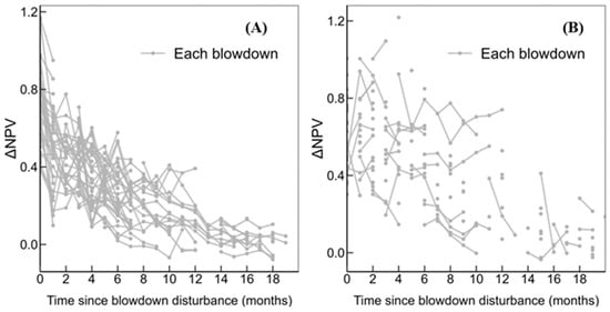 Changes in ΔNPV over time for all 45 blowdowns based on (A) PlanetScope NICFI and (B) Landsat-8.