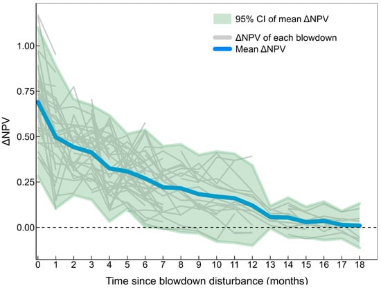 Changes in ΔNPV over time based on PlanetScope NICFI. (Blue line: mean ΔNPV values; grey curve: each blowdown event; green shades: 95% CI.)