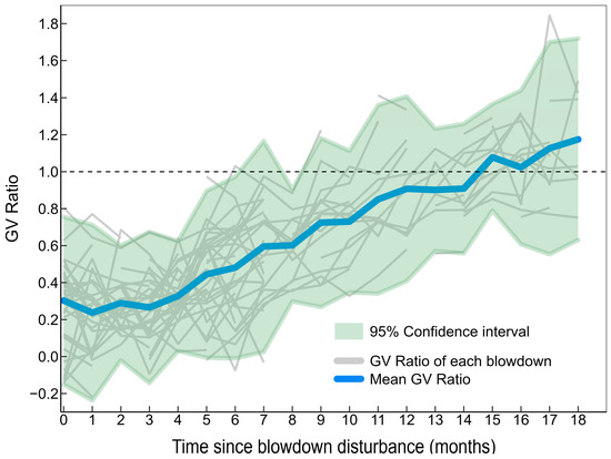 where is the average GV value of the ith month from also the month when the blowdown had highest NPV (i = 0); is the average GV of the sample pixels of the three pre-blowdown images. The average and its 95% CI of the GV ratio was then calculated for all blowdowns, recording its increase to 1 from the month of the ΔNPV maximum. When this ratio is greater than or equal to 1, the GV fraction has reached or exceeded the average pre-blowdown GV. This calculation is not the same as NPV because a simple ratio can reflect blowdowns’ GV changes.