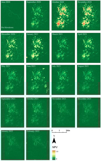 For the image with each blowdown first visible and all images afterwards, the difference in the NPV of the sample pixels between them and the pre-blowdown images (i.e., ΔNPV) was calculated. ΔNPVfirst thus refers to the difference between the average NPV of the first post-blowdown image and of the three pre-blowdown images (). This step allowed us to assess the magnitude of ΔNPV right after the blowdown, that is, the signal closer to the “true maximum change”, and to determine when the blowdown signals reached pre-disturbance levels. The higher the value of ΔNPVfirst, the more severe the damage to the forest [27]. In addition, it is also important to consider that blowdown-affected areas may suffer from delayed tree mortality and browning after the first visible image is acquired, so ΔNPV may increase compared to ΔNPVfirst. To find the maximum ΔNPV, we also search the for each blowdown, which is the maximum NPV value of the blowdown among all months. The difference between and is the maximum ΔNPV.