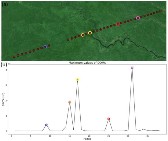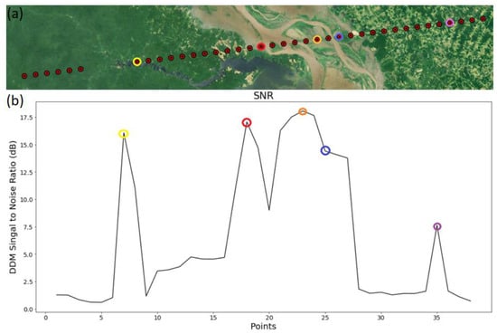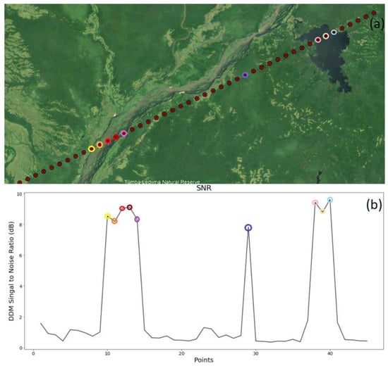 The maximum values correspond to the greatest strength of reflected signals of each DDM along-track, which occur normally at specular points. As it can be seen, the strength of coherent scattering signal over river (blue, orange, and yellow circles) is extremely higher (>2 × 1012 m2) than the reflected signal over land (~109 m2). Also, the strength of the scattered signal over the red specular point (~5 × 1011 m2) is of high power, since the signal reflects off from vegetated wetlands—close enough to small tributary of river—showing strong coherent features. The same phenomenon occurs both over purple specular point area and over the last two specular points.