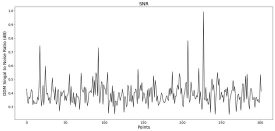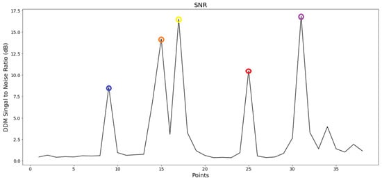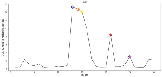 Previous graphs depict the BRCS maximum values from DDMs BRCS measurements over the specular points along each track. However, the coherent scattering from the smooth surfaces of inland water bodies could be ~30 dB stronger than diffuse scattering from rough surfaces, and this demonstrated that the smooth surface extends over the complete first Fresnel zone (~0.5 × 0.5 km2) [35,36]. As it is depicted below, the signal-to-noise ratio (SNR) of the reflected signals is highly variable, affected by surface type and roughness, vegetation water content, and vegetation density.