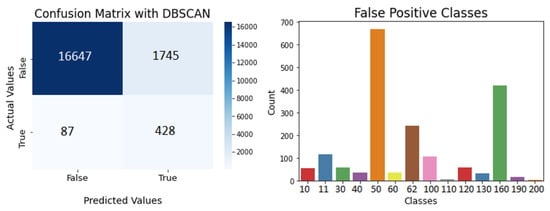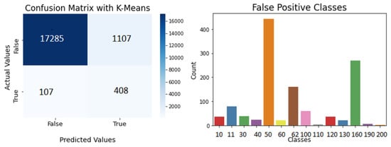 Furthermore, in Figure 11, the evaluation results are predicted, using the results with Agglomerative clustering as predicted values. As it can be seen, Agglomerative clustering detects less TN points than K-Means and higher number of FP. Also, FP outcomes are shown over the classes 50, 160 and 62 (tree cover, broadleaved and deciduous) of the Copernicus map. The Accuracy of the Agglomerative algorithm is 91.6%, while the higher number of FP compared to the K-Means algorithm results in the decrease in Precision (22.2%). Moreover, the Recall is 82.7%, thanks to the decrease in FN compared to the K-Means method.