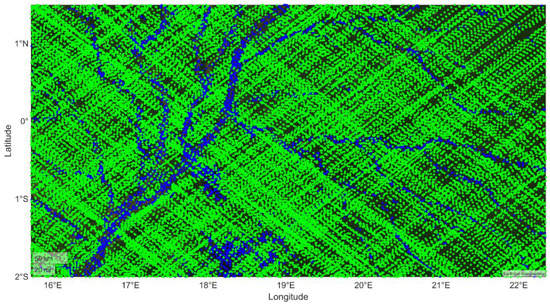 Using ground truth data from the yearly Copernicus land cover map, the K-Means algorithm distinguishes CYGNSS observations between land and inland waterbodies clusters with the highest accuracy. The number of FP detected via K-Means is considerably smaller than in the two other methods, whereas the number of detected inland waterbodies is almost equal. Therefore, in Figure 13, a map over the Congo Basin of the one-month CYGNSS observations, between the 1 and 31 August 2018, using the K-Means algorithm, is depicted. The blue points symbolize observations detected as inland waterbodies, while green points stand for observations over land.