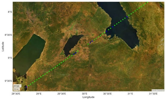 The second issue is related to false alarms over desert regions having exceptionally flat surfaces. Implementing the clustering methods over desert regions, such as in Sahara in the North part of African continent and in Rub’ al Khali Desert, shows the weaknesses of the algorithms to detect these areas as land and not as inland water bodies. Thus, the known absence of inland water within these regions enables their removal of CYGNSS observations over these regions to produce maps of inland water bodies. Also, a study reported similar false alarms over deserts in surface water datasets [48]. The last issue is the detection and mapping of large lakes around the globe. This is attributed to the big size of these water bodies. Wind roughening can cause coherence to be no longer the dominant mode of scattering. In Figure 16, the false clustering result over the Tanganyika Lake, the sixth biggest lake in the world, is depicted.