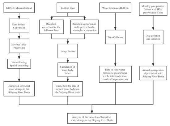 Water is the fundamental resource for the sustainable development of human societies and ecosystems [1] (Vörösmarty et al., 2010). Water resources play an essential role in the global hydrological cycle and climate regulation [2] (Zhu et al., 2023). Water scarcity in arid zones can limit local development of agriculture, industry, and infrastructure, among others. With the intensification of reservoir construction and climate change impacts, water scarcity and uneven spatial and temporal distribution in inland river basins in arid zones are more prominent [3] (Ma et al., 2020). Therefore, quantifying the spatial and temporal variation of terrestrial water storage in the Shiyang River basin based on GRACE data and calculating the area change of surface water bodies will help to understand the hydrological processes in the inland river basin of the arid zone.