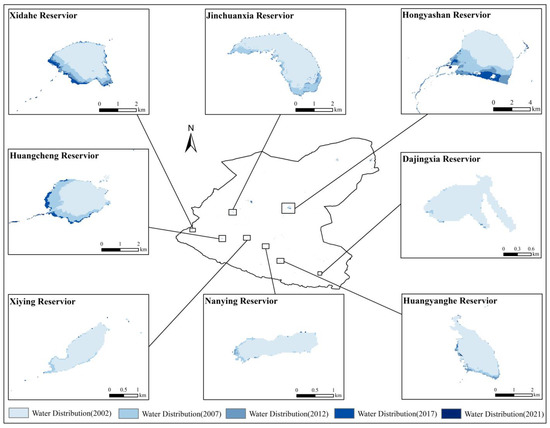 The interannual rate of increase in water body area in the Shiyang River basin from 2002 to 2021 is 5.77 km²/a and is significantly spatially variable (Figure 3). The watershed water body area increased steadily from 2002 to 2007 and was particularly pronounced from 2012 to 2017. The area of water bodies in the basin decreased between 2017 and 2021 but still showed an overall increasing trend. The area of water bodies varies among reservoirs in the basin (Figure 4). Among them, the water body area of Hongyashan Reservoir and Xidahe Reservoir maintained steady growth during 2002–2017. It slightly decreased in the latter five years, and their average annual changes were 1.909 km2/a and 0.302 km2/a, respectively. Jinchuanxia Reservoir and Huangcheng Reservoir have a large variation and similar trend in 20 years, with a general “V” shaped growth rate of 0.153 km2/a and 0.019 km2/a. The area of Huangyanghe Reservoir, Xiying Reservoir, and Dajingxia Reservoir tends to be stable and basically stable. The water body area of Nanying Reservoir shrinks significantly, maintaining growth in 2002–2007, while it continues to decrease from 2007 to 2021, and the water body area in 2021 has been lower than that in 2002, with an annual change rate of −0.029 km2/a.