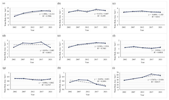 The change of reservoirs area in Shiyang River Basin ((a): Hongyashan Reservior; (b): Jinchuanxia Reservior; (c): Huangyanghe Reservior; (d): Huangcheng Reservior; (e): Xidahe Reservior; (f): Xiying Reservior; (g): Dajingxia Reservior; (h): Nanying Reservior; (i): Surface water body area of the watershed).