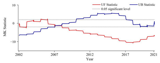 An MK test was conducted on the TWSA time series for the Shiyang River Basin from 2002 to 2021 (Figure 7). TWSA showed a non-significant downward trend in 2002, a non-significant upward trend in 2003–2005, a non-significant downward trend in 2006–2007, a significant downward trend in the data between 2008 and 2021, and a sudden change in TWSA from 2007 onwards.