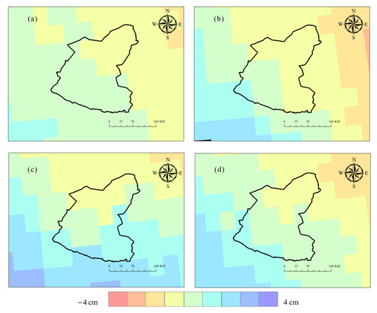 The variation of water reserves in a basin of the Shiyang River showed obvious seasonal changes, reaching the maximum value in autumn and the minimum value in spring (Figure 8). The distribution of water storage change variation in spring was roughly increasing from northeast to southwest, with a variation between −0.046 cm. The water storage change in the southwestern part of the basin could be clearer, and the largest deficit area of water storage in spring is in the northeastern part. Water storage distribution in summer roughly increases from northeast to southwest, with a change of about −0.05 cm. Compared to spring, the change in water storage deficit was more pronounced in the southwestern part of the basin and increased in the southeastern part due to the summer being in the flood season. The spatial distribution of water storage changes in autumn varies greatly, with a change of about −0.04 cm. Water storage changes in the northern part of the basin, and the spring and summer are roughly the same. The central, western, and southeastern water storage for the state of loss, of which the southeastern water storage loss is larger, is the largest loss of the four seasons. Winter water storage changes are decreasing trend in the distribution roughly from the southwest to the northeast. Except for the north and northeast water storage, the entire basin shows a loss state.