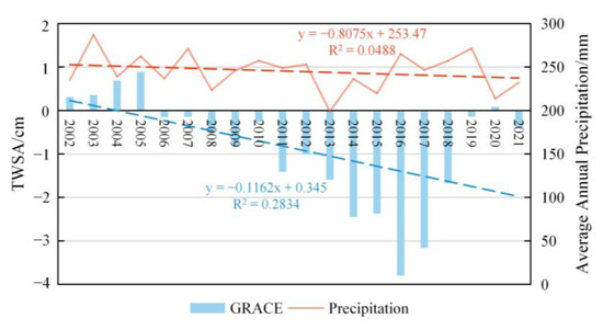 Precipitation significantly impacts surface water resources, and long-term precipitation deprivation may also lead to deficits in terrestrial water storage [29] (Shen et al., 2015). Precipitation and TWSA are very close in the basin of the Shiyang River. The overall trend and abrupt change in the rainfall profile of the Shiyang River Basin from 2002 to 2021 is insignificant (Figure 10). However, the interannual variability of TWSA is significant, and it shows large fluctuations with minor changes in rainfall; TWSA shows a non-significant upward trend from 2002 to 2005; a non-significant downward trend from 2006 to2009; and a significant downward trend from 2010 to 2021. It also began to change abruptly in 2007, which is consistent with the point of abrupt change in TWSA on a monthly scale (Figure 7).