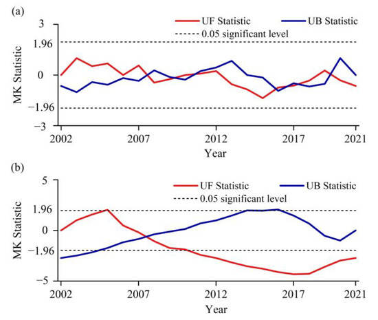 The MK test of the basin TWSA shows (Figure 12) that the upstream TWSA shows a non-significant downward trend in 2002, a non-significant upward trend in 2003–2004, a significant upward trend in 2005, a non-significant downward trend in 2006–2008 and a significant downward trend in 2009–2021. The upstream TWSA mutation point occurred in 2006. Midstream TWSA shows a non-significant downward trend in 2002, a non-significant upward trend in 2003–2004, a significant upward trend in 2005, a non-significant downward trend in 2006, a non-significant downward trend in 2007–2008, and a significant downward trend in 2009–2021. The midstream TWSA began to change abruptly in 2007. In contrast, the downstream TWSA shows a non-significant decreasing trend in 2002, a non-significant increasing trend in 2003–2005, and a significant decreasing trend in 2006–2021. Thus, the water storage status of the Shiyang River basin gradually deteriorates from upstream to downstream, which is consistent with the trend in TWSA on a monthly scale in the upper and middle reaches (Figure 11).