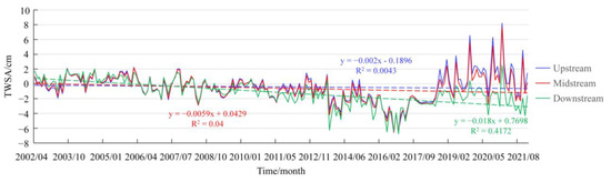Trends of TWSA in the upstream, midstream, and downstream on a monthly scale.
