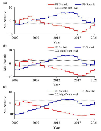 MK statistical curves for upstream, midstream, and downstream TWSA ((a): Upstream; (b): Midstream; (c): Downstream).