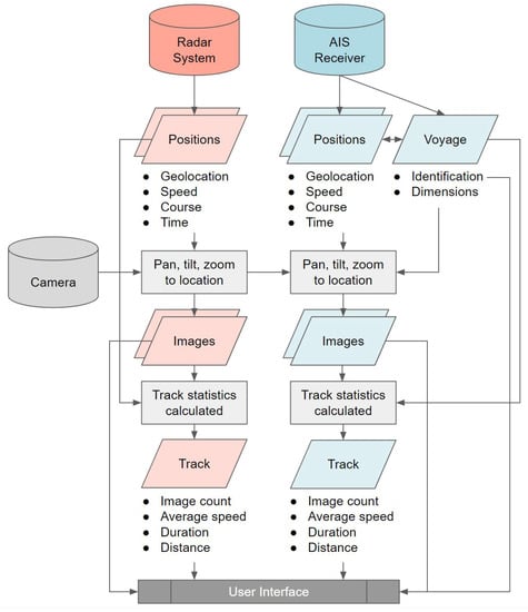 The primary system sensors and processes are shown in Figure 3. In addition to the radar and camera components, the system includes a very-high-frequency (VHF) antenna and AIS receiver to collect messages from AIS broadcasts in the area. Comparing known AIS records with potential duplicate records from another sensor can be helpful for differentiating between cooperating and non-cooperating vessels (e.g., [66,67]). Figure 3 highlights the similarity of radar and AIS data and processing.