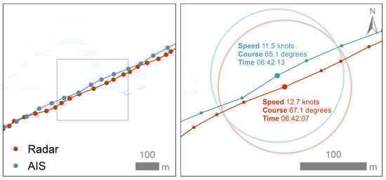 Figure 4. Example of associated radar and AIS detections that meet the defined criteria based on similar position (shown with 100 m buffer around points), movement vector (speed and course), and history (time).