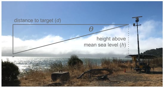 where h is the camera’s height above the water and d is the distance to the vessel (Figure 6). Additional tilt adjustments can be defined in bearing angle ranges (i.e., pie slices) to compensate for a camera mount that is not absolutely plum, common in rugged environments [80].