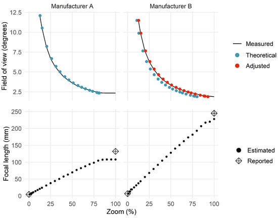 Finally, an adjustment factor is experimentally applied to (5) to fit the resulting theoretical zoom levels to the measured levels, if necessary, so that the ideal field of view is captured (Figure 7). Manufacturer specifications typically provide the minimum and maximum focal lengths, and these generally align with estimated values (Figure 7).