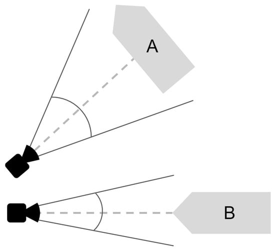 Figure 8. Image width considers orientation of vessels with the camera. If vessels A and B were the same size and equidistant to the camera, vessel B would have a smaller image width and, thus, a higher zoom level than vessel A.