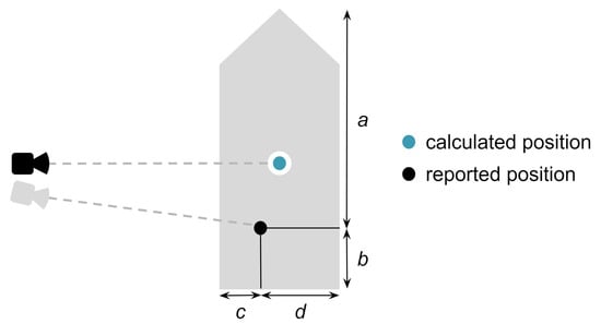 Figure 10. Vessel dimensions (a, b, c, d) provided in AIS data with respect to the reported position [84]. Dimensions are used to calculate the position of the geometric center of the vessel for camera cuing purposes.