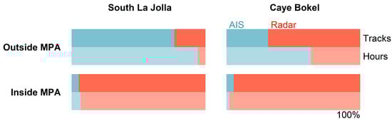 Figure 12. Percentage of total tracks and track hours detected by radar or AIS outside and inside the MPAs at each case study site.