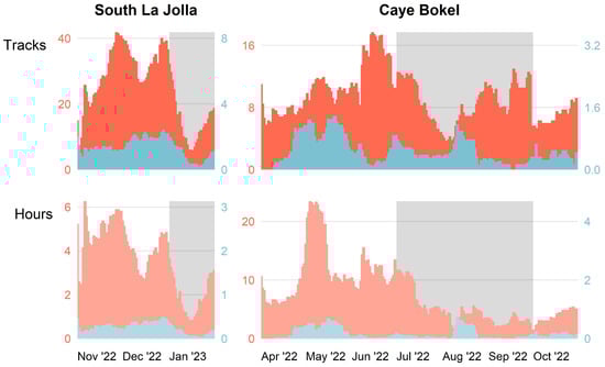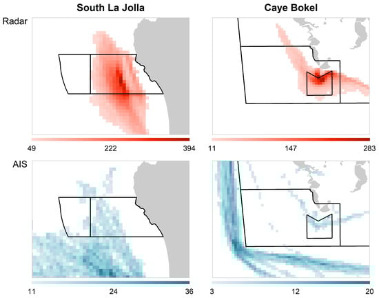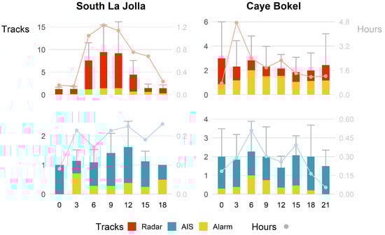 Based on deployment dates and system functioning, we collected data from November 2022 through January 2023 at the South La Jolla site and from April 2022 through October 2022 at the Caye Bokel site. Occasional gaps in monitoring occurred due to system maintenance, so we only considered data from days when both radar and AIS data were received. This resulted in 92 days of analysis at South La Jolla and 150 days at Caye Bokel. Radar tracks that duplicated AIS tracks, and those that were most likely false targets, were not included in analysis. Due to potential error in AIS track fusion and the machine learning model used to identify false targets, we consider radar data an estimate of activity sufficient to understand broad patterns in activity.