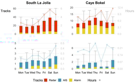 Activity detected by AIS was common outside the MPAs, but, inside the MPAs, there was far more activity detected by radar compared to AIS at both case study sites (Figure 12). At South La Jolla, 94.8% of tracks observed in the MPA were detected by radar and accounted for 93.2% of track hours. The standard deviation values in Table 1 are meant to indicate the variability across days. At Caye Bokel, 94.5% of tracks in the MPA were detected by radar, accounting for 97.8% of track hours. There were over 200 images of radar-detected targets, on average, collected daily at South La Jolla and over 100 images at Caye Bokel.