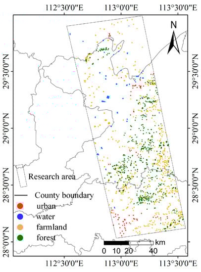 The ground objects in the study area were divided into four types: urban, water, farmland, and forest. The existing land cover data for Hunan Province, where the study area is located, had a small proportion of grassland at 0.6%, so there was no separate classification for this category. The position of the land cover samples is shown in Figure 2. The selected 1359 sample patches contained a total of 506,575 pixels. In this study, 50% of them were randomly selected as training samples and the remaining 50% as test samples. The parameters of the samples are shown in Table 2.