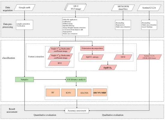 The flow chart of this study on the LCC model is shown in Figure 3. After data collection and preprocessing, the LCC method was mainly divided into three steps. In Step 1, the backscatter coefficients and were extracted, and the DpRVIm was designed and proposed. In Step 2, the J-M distance analysis was performed for each land cover type to select the optimal set of features, and the DpRVIm was analyzed in comparison with the classic radar vegetation index. In Step 3, a new classifier, the 1DCNN-MRF, was designed for LCC and compared with classic machine learning methods such as RF, KNN, and the 1DCNN, giving quantitative and qualitative evaluations.