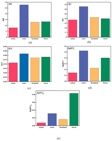 The values of the samples were used to generate the average value change curves of each feature for different land cover types, as shown in Figure 5. In the numerical distribution of the backscatter coefficient, water had a low backscatter coefficient (Figure 5a,b), which was easier to separate from the other three land types. In addition, the backscatter coefficients of farmland and forest were relatively close to each other, which meant that it was more difficult to distinguish them. As shown in the distribution of the RVI values (Figure 5c), the RVI values of farmland and forest were close to each other, which was still difficult to distinguish, while the types water and urban remained well separable. The distribution of the DpRVI (Figure 5d) values showed a slight increase in the gap between forest and farmland, indicating that forest was easier to distinguish from farmland in the DpRVI compared to the previous three features. The mean values of the DpRVIm (Figure 5e) for different land types were highly variable, with forest being significantly higher than the other three land types. Influenced by the scattering characteristics of the ground, the difference in the values of the DpRVIm between urban and farmland was slightly smaller, while a similar phenomenon also existed in the distribution of the DpRVI. In conclusion, in terms of the numerical distribution, the backscatter coefficient and RVI were advantageous in water and urban extraction, and the DpRVI and the DpRVIm based on polarization decomposition increased the perspective of analyzing ground objects, with better separability between farmland and forest.