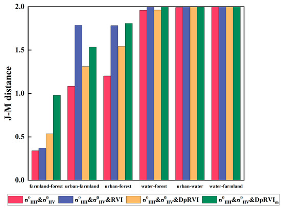 In order to analyze the degree of separability of different feature combinations for different land types, we set up four groups of feature combinations. The J-M distances of different land cover types in each feature combination were calculated based on Equation (6).