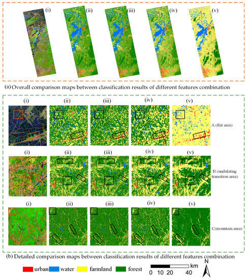 Classification results of different feature combinations: (i) Sentinel-2A (11-8-3/SWIR-NIR-Green), (ii) + , (iii) + + RVI, (iv) + + DpRVI, (v) + + DpRVIm. (a) Overall comparison maps. (b) Detailed comparison maps.