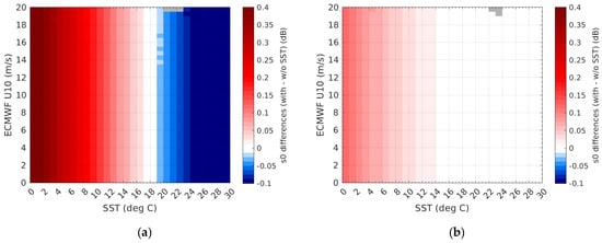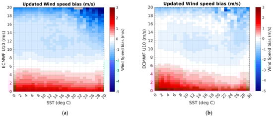The improvement is more obvious and significant in the Ka band, as seen in panel (a) of Figure 3. The U10 biases related to the SST correction vary between −1.5 and +0.5 m/s when moving from the coldest SST to the opposite warmest conditions, especially for winds above 10 m/s. If most of the SST dependence in Figure 1 is removed, some residual features remain. In the Ka band, these concern situations where the SST is larger than 18 °C and winds are lying above 14 m/s, while for the Ku band, the differences with ECMWF data show a small residual SST dependence for SSTs colder than 10 °C and winds below 5 m/s.