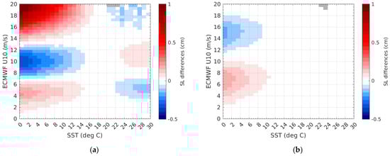 Concerning the Ka band results shown in Figure 4, the impacts are greater, as expected, since the Ka band SSB behavior is more sensitive to changes in wind speed, and also because the U10 change with SST is larger. As for the Ku band, the effective SST correction impacts on SL also depends on wind speed, but in a different manner and mostly for the coldest and the warmest waters. The most significant changes (>5 mm) occur in polar regions, when the SST < 4 °C and the wind conditions are above 14 m/s. It can even reach 1 cm for stronger winds above 18 m/s.