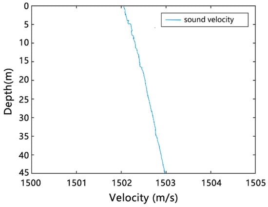 From the perspective of the seawater acoustic velocity profile obtained from the experiment shown in Figure 3, the sound velocities were very uniform (within 1502–1503 m/s).