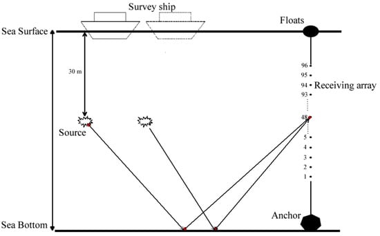 In the operation area, the water depth at the workstation was ~45 m. A 17.1m-long vertical receiving array was laid into the water. The array consisted of 96 elements, set 18 cm apart. The survey ship, Xiangyanghong 81, carried a sound source to complete the horizontal movement and the source was sunk at a depth of 30 m. The experimental devices were configured as shown in Figure 4.