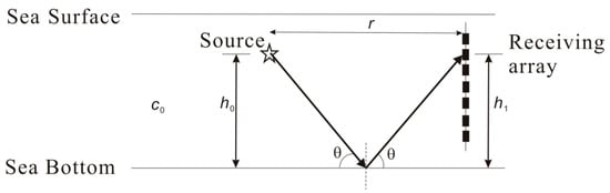 To obtain seafloor reflection data, the sparker emitted the acoustic signal. According to the geometric relationship between the source and receivers shown in Figure 5, the horizontal-l distance between the source and the vertical receiving array is , the height of the sound source relative to the seafloor is , and the height of a certain element in the vertical linear array relative to the seafloor is . Single-channel experimental data were processed; that is, for a set of fixed values of , , and , the seabed reflection loss at the corresponding graze angle  was calculated. According to the configuration of the experimental devices shown in Figure 5, when both  and  were constant, the survey ship carrying the sound source was moved to vary the distance  between the source and the vertical receiving array such that the sound source emitted acoustic signals at different horizontal positions, which were then received by the vertical receiving array to enable calculation of the bottom reflection losses within a given range of grazing angle. Signals emitted and received at multiple horizontal distances yield a wider range of grazing angle to meet the inversion requirement.