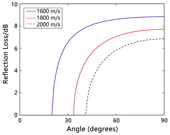 Figure 6 shows the graph of bottom reflection loss versus grazing angle for different seafloor acoustic velocities under the assumption of a liquid half-space hypersonic seafloor model. The simulation model parameters were as listed below: seawater sound velocity = 1500 m/s; seawater density = 1.0 g/cm3; seafloor sound velocities = 1600, 1800, and 2000 m/s; seafloor density = 2.0 g/cm3; and computing frequency = 2000 Hz.