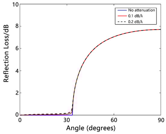 Figure 7 shows the graph of bottom reflection loss versus grazing angle for different seafloor acoustic attenuation values based on the liquid half-space seafloor model. The simulation parameters of the model were as listed below: seawater sound velocity = 1500 m/s; seawater density = 1.0 g/cm3; seafloor sound velocity = 1800 m/s; seafloor sound attenuation values = 0, 0.1, and 0.2; seafloor density = 2.0 g/cm3; and computing frequency = 1000 Hz.