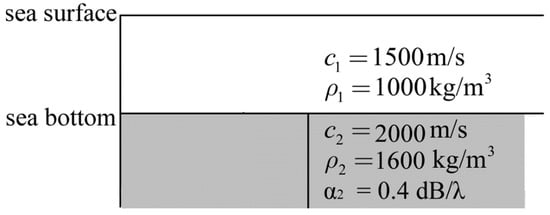 Figure 8 shows a theoretical model of a Pekeris waveguide with a seafloor interface. In the numerical example, the seawater layer and the sediment layer are assumed to be uniform and isotropic. The source frequency was 50 Hz. The seawater acoustic velocity and density were 1500 m/s and 1000 kg/m3, respectively. The seafloor acoustic velocity and density were 2000 m/s and 1600 kg/m3, respectively. The seafloor acoustic attenuation was .