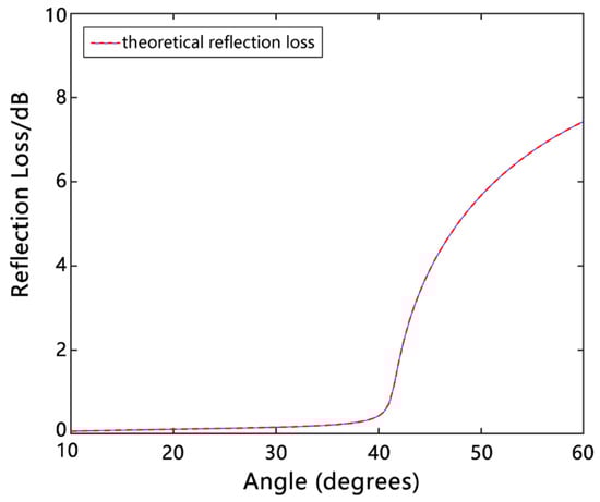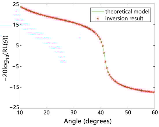 The inversion process of sediment geoacoustic parameters based on bottom reflection loss is given here according to the computing steps of the genetic algorithm [,]. In this modeling example, the parameters to be inverted were acoustic velocity and the attenuation of seafloor sediments. In the experiment, the range of acoustic velocity was to be 1450–3500 m/s, with the number of individuals in this range to be 1001. The acoustic attenuation was determined to range from 0.1 to 0.6 and the number of individuals in this range was 1001. Each model parameter to be inverted was represented as a 20-bit chromosome string based on the character set . The values (i.e., individual phenotypes) of the original acoustic velocity and attenuation were encoded into a series of binary character strings (i.e., individual genotypes). The binary-to-decimal character conversion enabled the conversion of an individual genotype into an individual phenotype. Substituting different individual phenotypes into the forward model yielded a number of bottom reflection coefficients  within a wide-grazing-angle range, which were then converted into reflection losses according to . Because it is very difficult to obtain the reflection loss at the minimum angle and that at the maximum angle in the actual operation at sea, the data in the range of 10–60° were taken as an example for the inversion calculation, as shown in Figure 10.