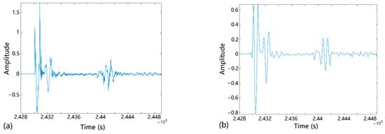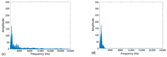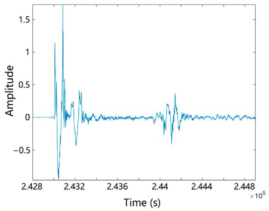 The processing of raw data shown in Figure 13 is taken as an example. It is clear that obvious signal noise was present, most of which was high-frequency noise. Therefore, the wavelet transform was considered to filter the high-frequency signal. Based on the wden function in MATLAB software, the “sym8” wavelet was used to decompose the signal. On layer 5 of the decomposition, the heuristic “heursure” threshold selection method was used to low-pass filter and denoise. The denoising results are shown in Figure 14. From the filtered spectrum, it is evident that the high-frequency noise was eliminated and the acoustic signal was well preserved. The frequency band of the effective signal is about 100 to 2000 Hz, which is in the low-to-mid frequency range.