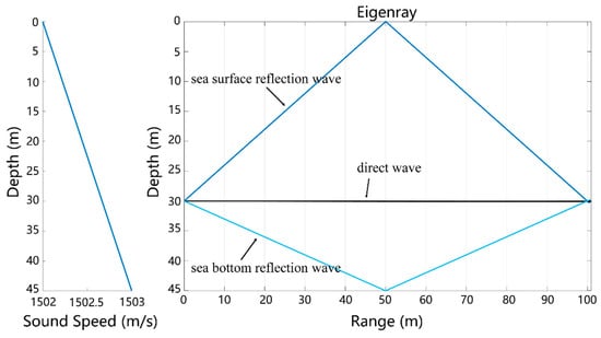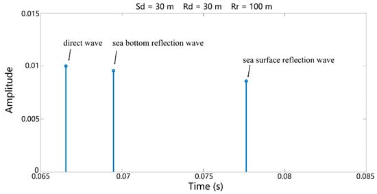 To invert geoacoustic parameters based on the reflection loss from the seafloor within wide grazing angles, it is necessary to extract the direct wave and bottom reflection signal from the signal filtered by the wavelet transform in the previous section. By taking a hydrophone at a receiving point at a depth of 30 m and a horizontal distance of 100 m, for example, the sound ray trace and response times calculated using the ray model [] are presented in Figure 15 and Figure 16, respectively. Evidently, depending on the travel time of arriving at the receiving point, it is possible to distinguish direct waves, seafloor reflection waves, and sea surface reflection waves in the signal, thereby enabling the pickup of direct waves and seafloor reflection waves.