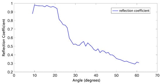 For each shot signal received, the propagation distance was calculated from the depth of the sound source, depth of the receiving point, and travel time. The grazing angle of the seabed reflected wave was obtained according to Figure 5, and the intensity of the bottom reflected signal and the direct signal, denoted by  and , were determined in turn. The direct wave is used as the incident wave and the reflected wave is represented by the actual reflected signal. Performing correction to offset expansion losses, the reflection coefficient was then calculated using