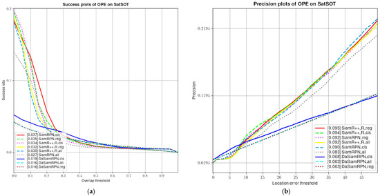 - We integrate the VISO dataset, which is suitable for the VOT and SatSOT VOT tracking dataset for remote sensing, to verify the effect of the adversarial sample attack on the two datasets. The experiment proves that our method of generating adversarial samples can effectively reduce the success rate and precision rate of the RPN-based Siamese Network.