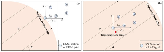 Many studies [27,28,29,30] have shown that when a tropical cyclone approaches a GNSS station, the PWV and ZTD over the station will significantly increase, and when it begins to move from the station, the PWV and ZTD will reach their maximum and begin to significantly decrease. Thus, the time of the sudden increase and decrease in ZTD time series over several stations can be used to estimate a tropical cyclone’s movement. Figure 1 shows the geometric relationship between a tropical cyclone and sites (i.e., GNSS stations or ERA5 grids).