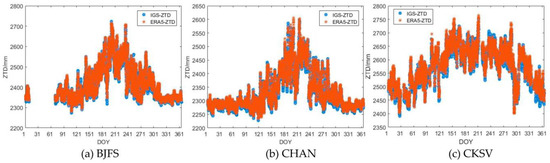 From Figure 3, it can be seen that the variations in the ERA5-ZTD and IGS-ZTD time series are almost the same, and the value of ZTD is highest in summer (DOY 151–241). The possible reason for this is the increase in the zenith wet delay (ZWD) caused by the increase in water vapor in summer, due to the large amount of water vapor transported by the southeast monsoon in China, and then the frequent movement of water vapor causes the changes to be more pronounced.