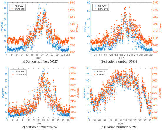 Many previous studies on the characterizations of tropical cyclones have mainly been based on PWV, because water vapor is an important part of a tropical cyclone, which can reflect the life cycle and movement of a tropical cyclone [27,28,29]. Since PWV can be converted from ZTD, when both time series have similar variations trends, it is possible to use ZTD instead of PWV to forecast weather events. The RS datasets can provide accurate PWV data, and can be used to analyze the variation trends between ZTD and PWV. Table 3 shows the number, geodetic coordinates and elevations of the four randomly selected RS stations, and Figure 4 shows the times series with 12-h ERA5-ZTD and RS-ZTD over the four stations.