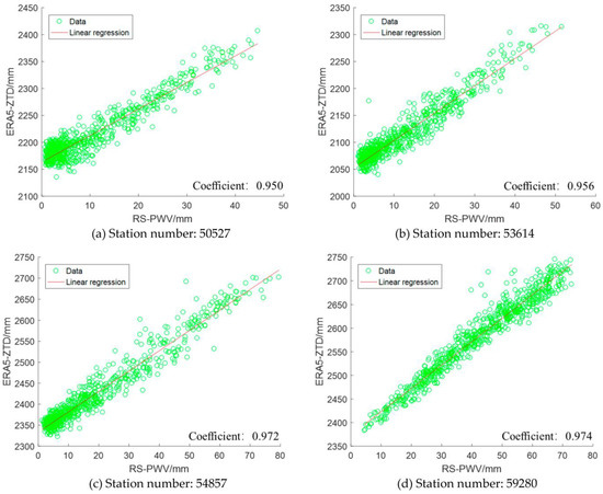 From Figure 4, it can be seen that the variation trend in the RS-PWV time series is the same as that of the ERA5-ZTD time series; the linear regression analysis of the RS-PWV and ERA5-ZTD time series was then carried out. The correlation coefficients between the two time series were calculated, and the linear regression analysis results of the RS-PWV and ERA5-ZTD time series are shown in Figure 5.